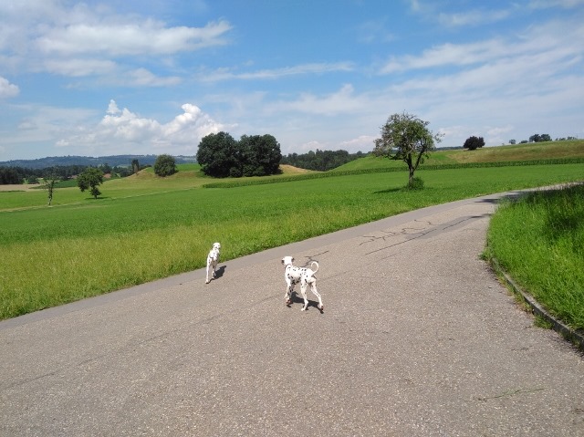 Die Dalmis Marilyn und Monroe (li) verbringen die Zeit mit mir im Wald und in unserem alten Wohnquartier.