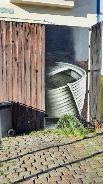 Vom Damm aus sieht man in eine Bootswerkstatt. Dort steht die Vive la Vie