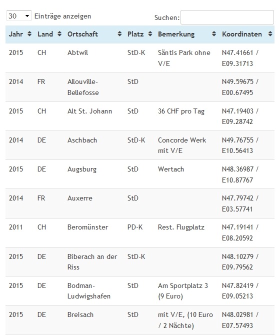 Ich habe einen kleinen Teil meiner Privaten Stellplatz Datenbank in den Blog eingebaut. Hier sind gelistete Orte mit dem Jahr verzeichnet wo wir schon übernachtet haben.
