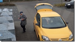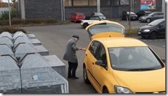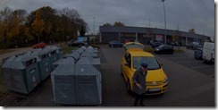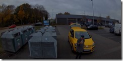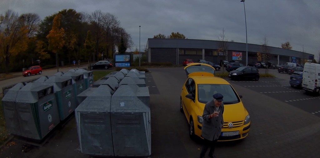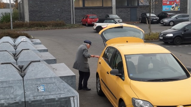 An einem Supermarkt machten wir einen Halt um Kleinigkeiten einzukaufen. Ich stellte unser Wagen vor die Glasentsorgung. Eine Rentnerin warf Glas für Glas in den Container.