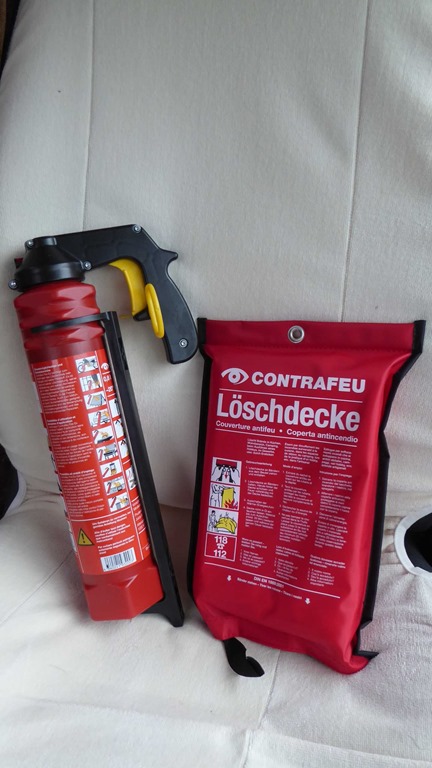 Neu haben wir an Bord einen Feuerlöscher (0.8l) und eine Löschdecke zum ersticken von Feuer. Der Löscher ist in seinen Abmessungen in vielen Bereichen einsetzbar zur Bekämpfung von Entstehungsbränden und das Ablöschen brennender Personen. Denn geeignet Platz habe ich noch nicht gefunden, wird aber wahrscheinlich zwischen Wohnabteil und Fahrerhaus hinter dem Fahrersitz sein.