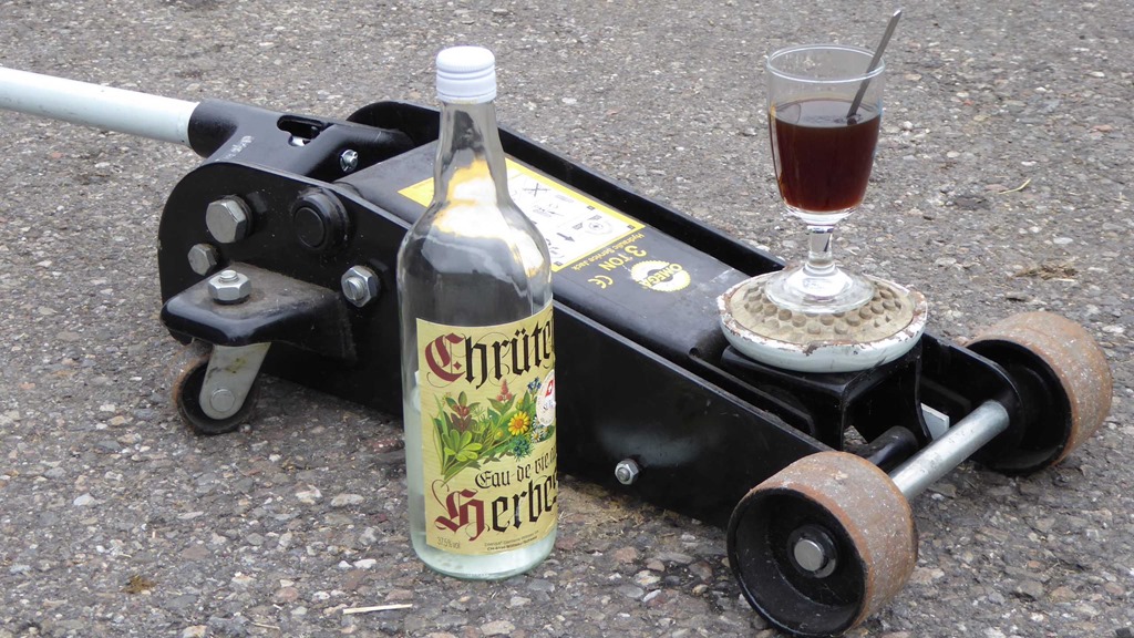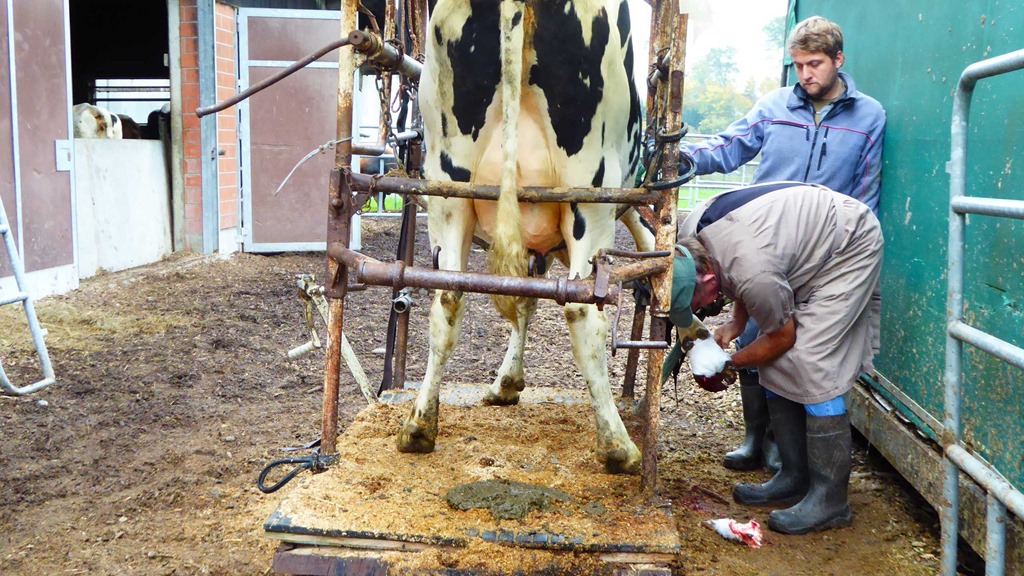 Hoffentlich hat der Viehdoktor kein Alkohol im Blut. Könnte für die Kuh schlecht ausgehen.