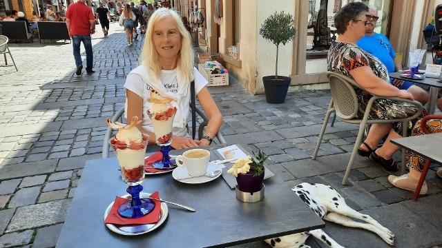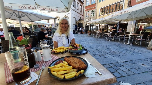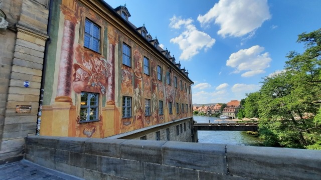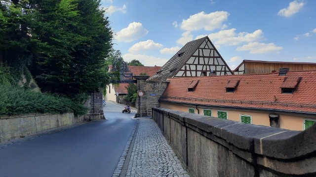 Wir setzten uns mitten in Bamberg in eine Gartenwirtschaft. Aufgefallen ist uns die enorme Polizeipräsenz. Und es wurden immer mehr. Sicherheitsbeamte mit Knopf im Ohr, Mannschaftswagen mit Kampfbereiten Polizisten, Fahr.- und Motorradstreifen und als krönender Abschluss ein Helikopter der über unseren Köpfen kreiste.