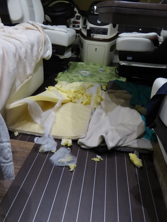 Eine schlechte Idee für uns. Morgens um 2 Uhr bin ich erwacht, Monroe (li) sass vor der Tür und wollte raus. Im Tempo-Teufel habe ich den Trainer angezogen und bin raus mit ihr. So eilig hatte sie es dann aber doch nicht. Nach kurzer Dauer machte sie ihr Geschäft und wir gingen zurück. Retour im Reisemobil machte ich Licht, und was sehe ich?