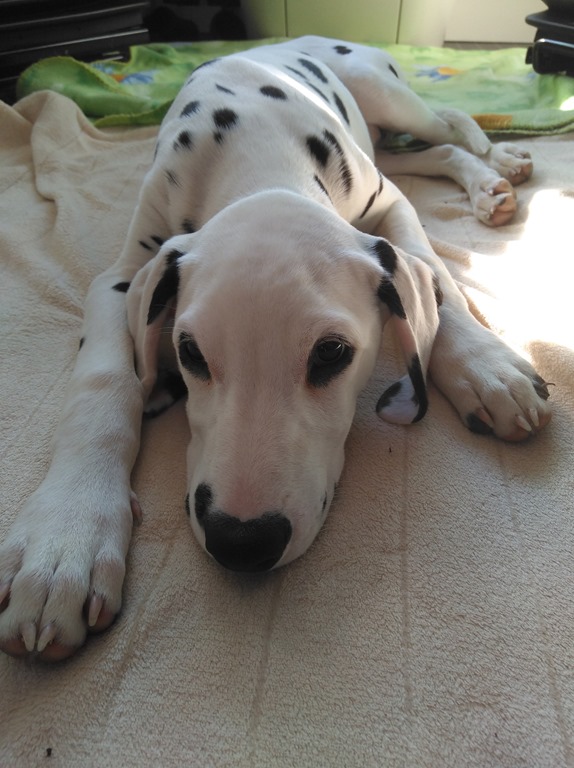 Die Hunde waren richtig müde.  Bis zu dem Zeitpunkt hatten wir das Gefühl die besten Dalmis der Welt zu besitzen. 40 Tage sind sie nun bei uns und nichts, aber auch gar nichts haben sie kaputt gemacht. Das Spielzeug dass für solche Aktivitäten gedacht ist wurde in Ruhe gelassen. Kein Teddy ausgehöhlt, kein Stoffwedel zerrissen.