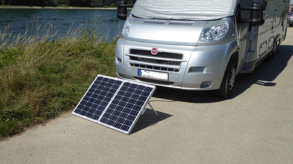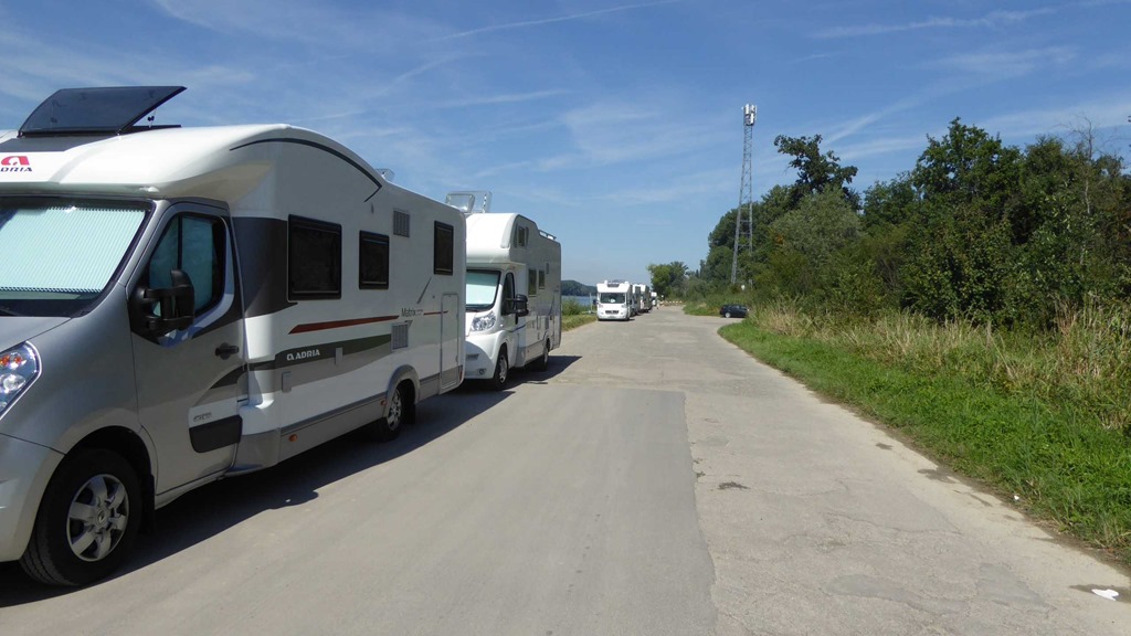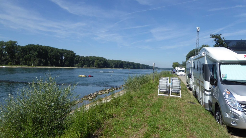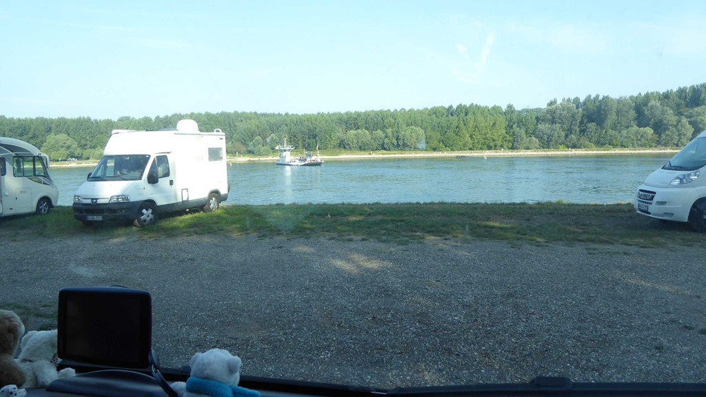 An diesem heissen Sommertag standen sehr viele Fahrzeuge am Rhein. Entdeckt haben wir nur einen Dauerbewohner. Erkennungszeichen Solar Panel vor dem Auto.