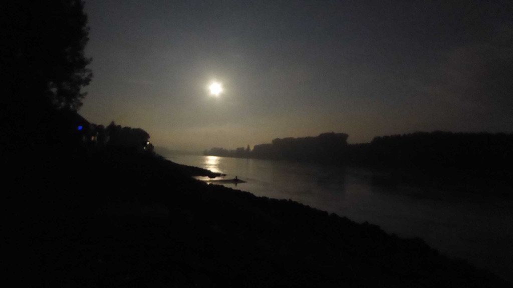 Die Nacht war unruhig für mich. Sonja zog ich mit in den Strudel. Abschalten ging nicht, innerlich ist alles noch angespannt. Morgens um 5 Uhr bin ich mit Cora raus. Der Vollmond über dem Rhein, ein traumhaft schönes Bild.