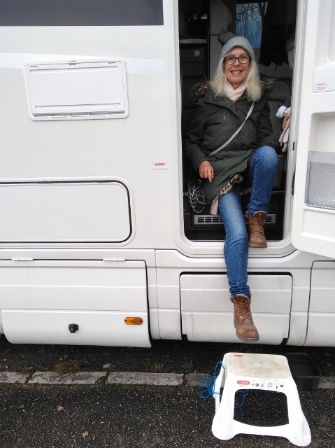 Sportlich springt Sonja aus dem Wagen. Unsere Trittstufe ist immer noch ausser Betrieb.
