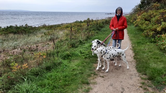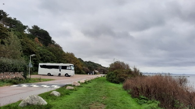 Direkt am Meer mit einem schönen Weg zum Spazieren. Der starke Wind stört uns nicht. Gut angezogen hält uns nichts im Auto.