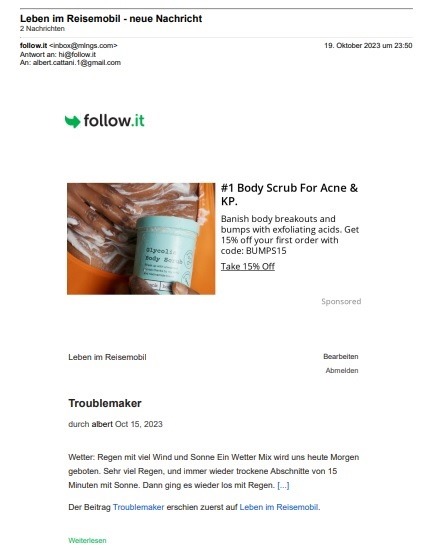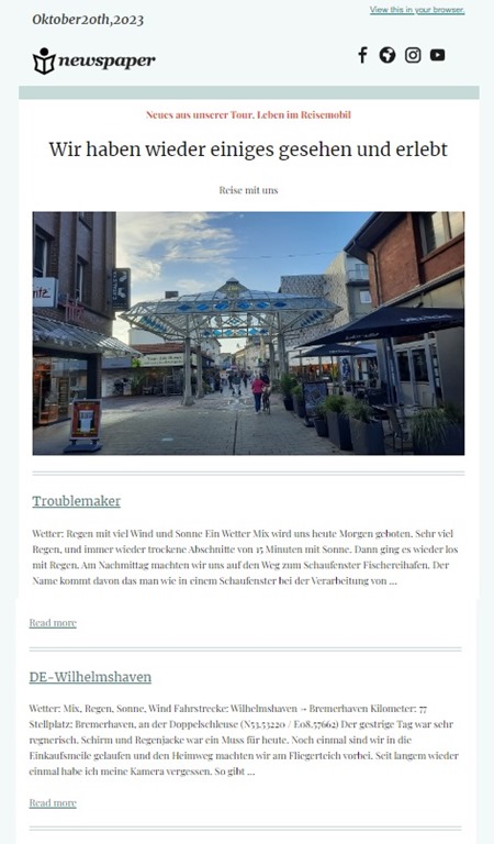 Ich hoffe im Leser gefällt das Layout und vor allem, es werden mehrere Tagebuch Berichte zusammengefasst, somit wird Dein E-Mail-Fach entlastet. Mal schauen wie das so anläuft.