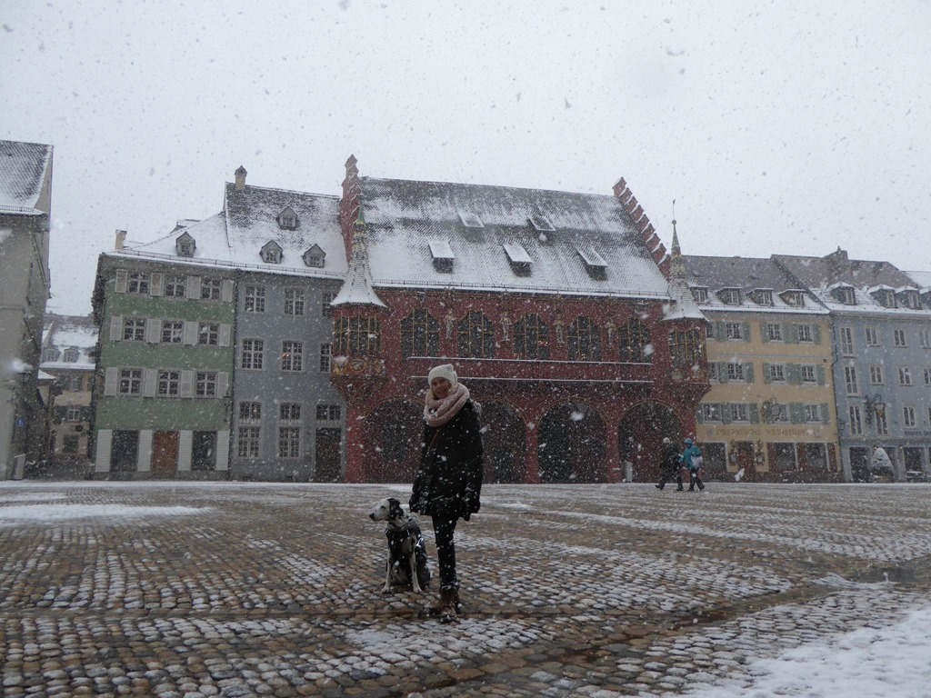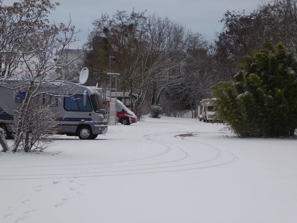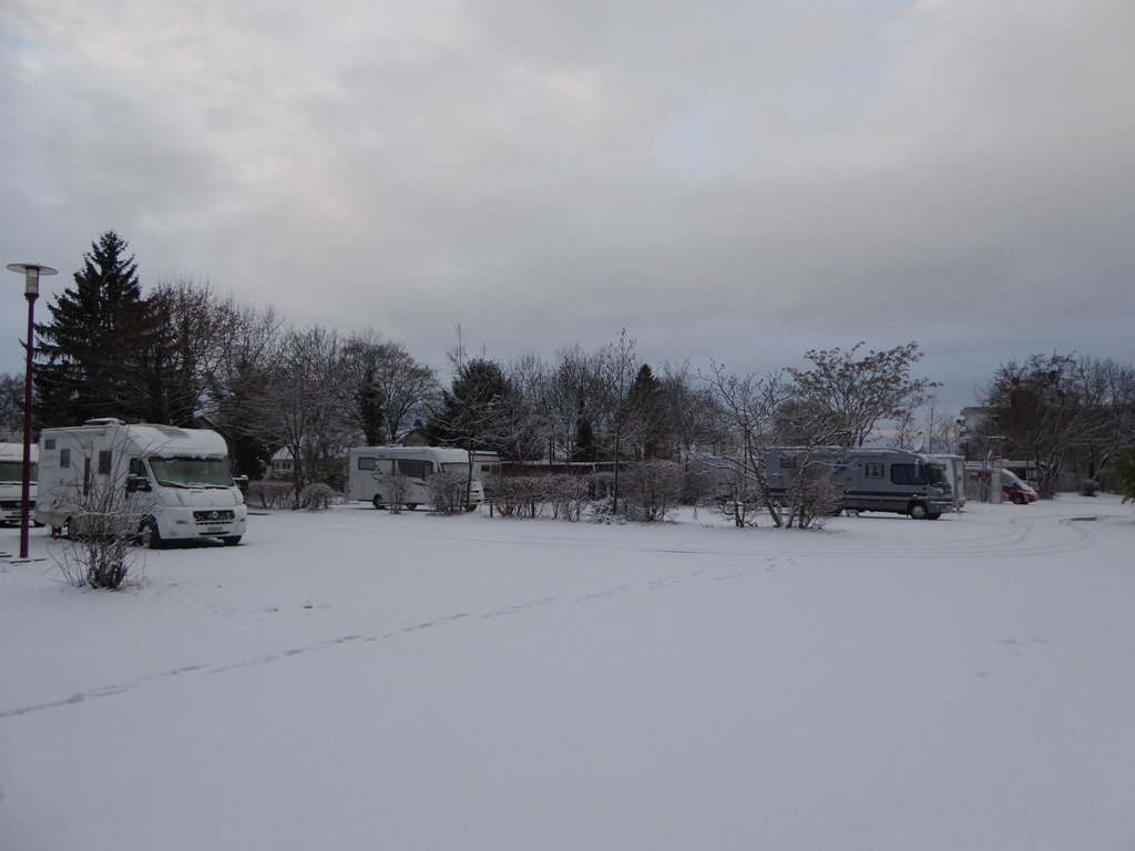 In der Nacht hat es geschneit. Der Stellplatz in Freiburg war nicht sonderlich stark besucht. Ist doch klar, es ist ja Januar und nicht August.