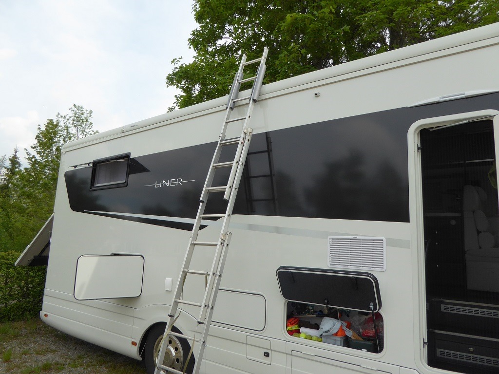 Denn Morgen gingen wir gemütlich an. Es gab einige kleine Arbeiten die erledigt sein wollten. Dabei habe ich meine grosse Leiter optimiert. Um auf das Dach zu kommen ohne den Aufbau zu zerkratzen musste ich diese mit einem Schutz versehen.