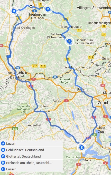 Fahrstrecke: Pfaffenweiler –> Breisach –> Lörrach –> Luzern