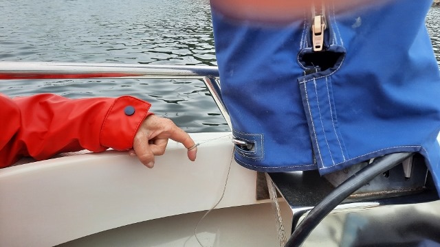 Das Seil der Angel am Finger, wenn es ruckt ist einer dran
