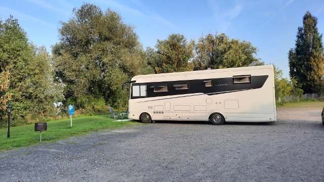 Der Weg von der Stadt zum neuen Stellplatz war ganz kurz. Schnell standen wir nach dem Mittag bei der Rheinfähre in Xanten. Die linke Seite mit 6 Fahrzeugen war belegt. Die rechte Seite mit über 30 Plätzen war leer. Warum da niemand war, keine Ahnung.