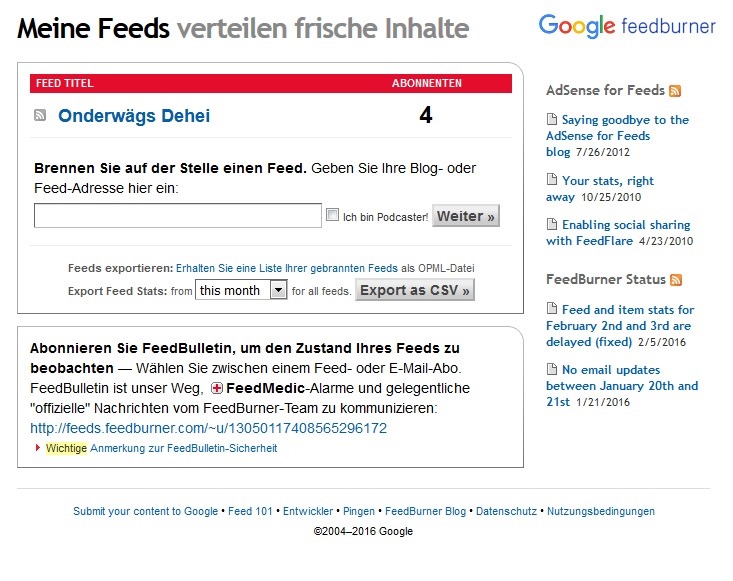 Das nächste Ziel ist ein RSS Feed auf meine Blog anzubieten. Wieder lesen uns sich schlau machen. Mit Feedburner fand ich ein Tool das funktionieren könnte.