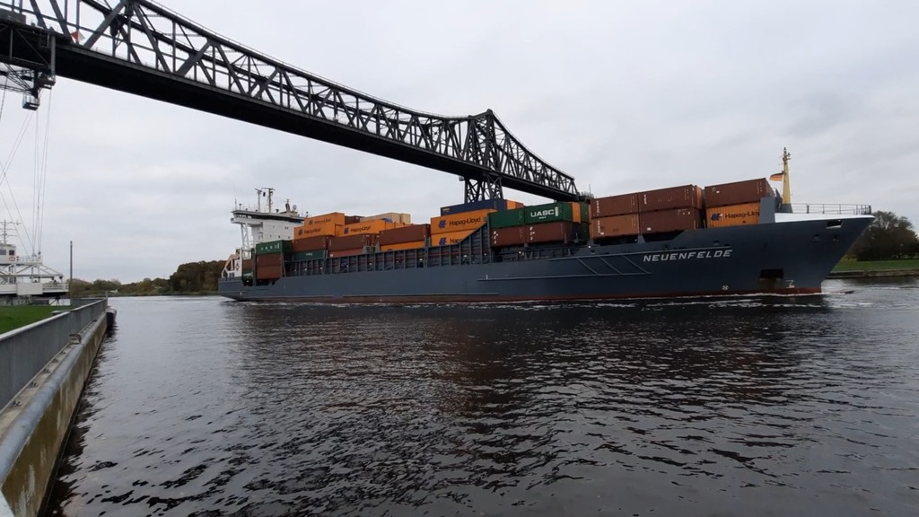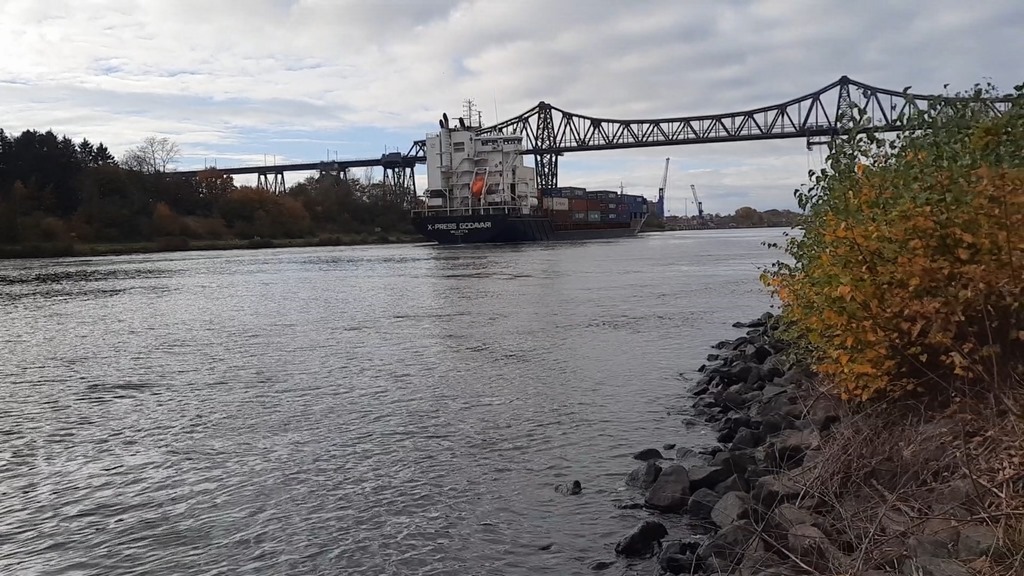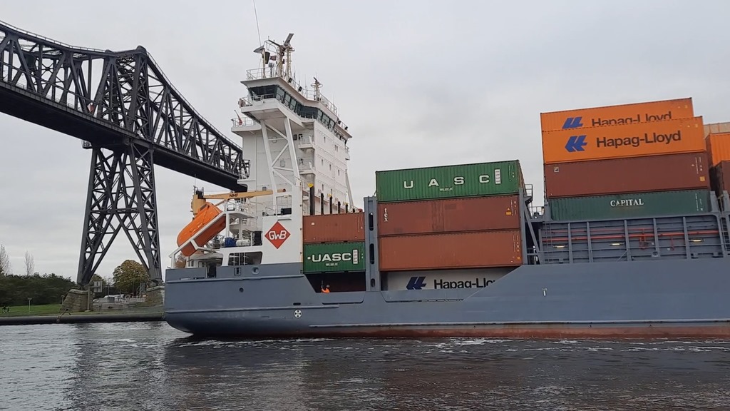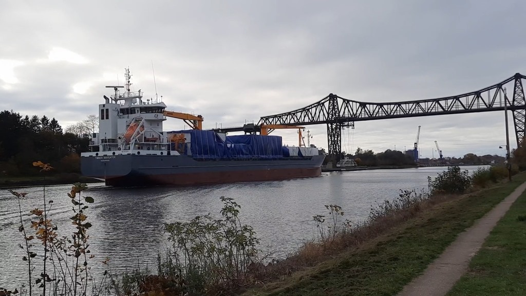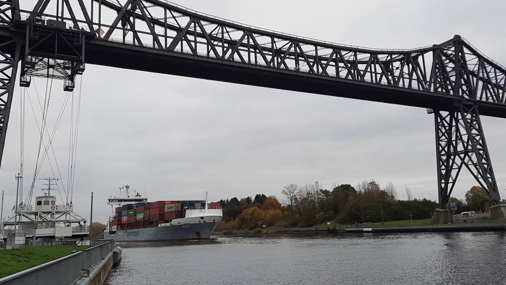 Zurück am Kanal gab es wieder etwas zu sehen. Einige grosse Schiffe fahren unter der Hochbrücke durch.