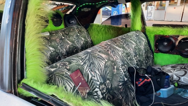 Mit sehr, sehr, sehr lauter Musik kommen die Ami Fans Chaoten zum Tanken auf den Platz