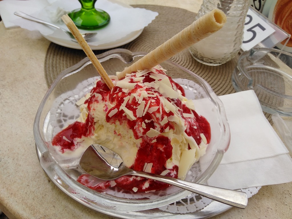 Bei dem schönen Wetter gingen wir gleich ins Zentrum. Dort setzten wir uns in eine Restaurant und ich bestellte mein aller, aller erstes Spaghetti Eis in meinem Leben.
