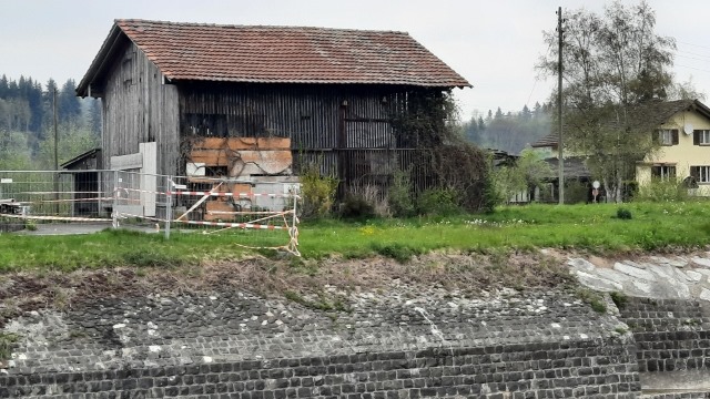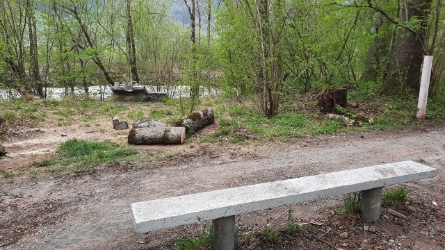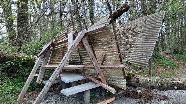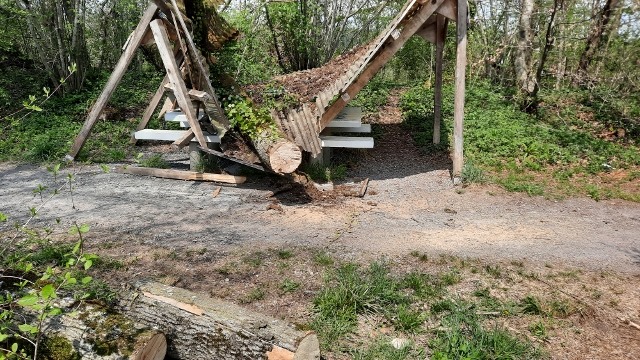 Gesehen auf dem Weg rund um die Emme. Ein Baum zertrümmerte die Grillstelle im Wald