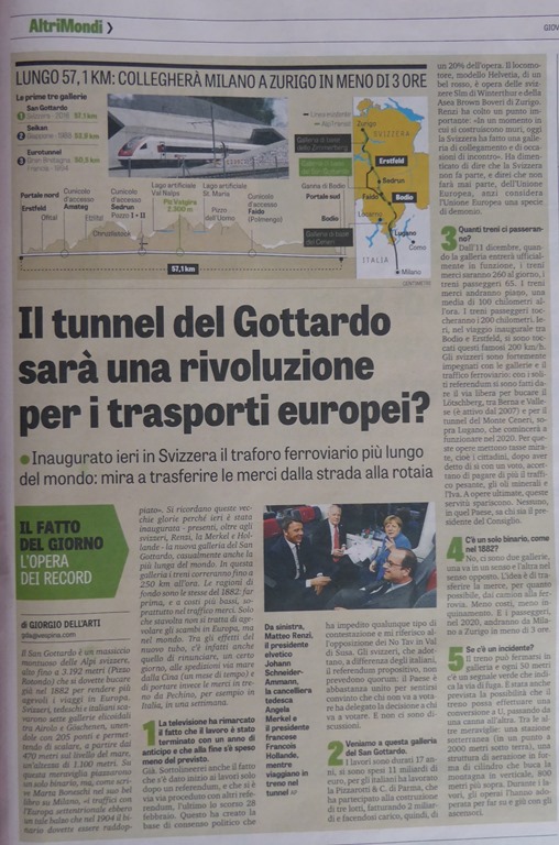 Auf dem Tisch lag eine Zeitung. Schnell habe ich diese durchgeblättert und sah erstaunt das in der Zeitung die Eröffnung des Schweizer Neat Basistunnel einen doch recht grossen Abschnitt von der Redaktion erhielt.