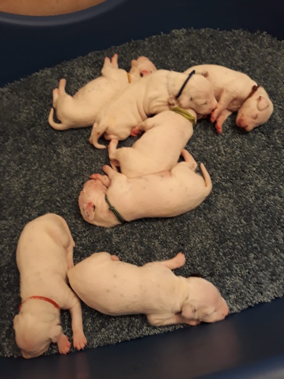Per SMS wurden wir von der Züchterin informiert dass alle Mädchen braun-weiss sind. Also haben wir uns auf eine neue Farbe in unserem Haushalt eingestellt.