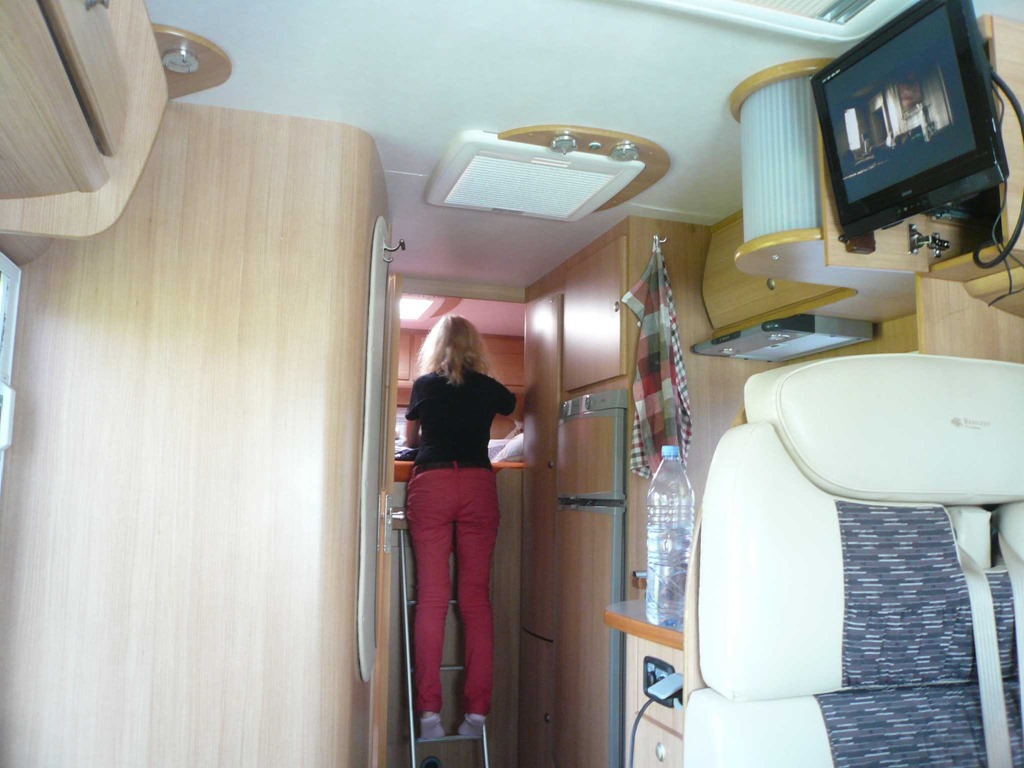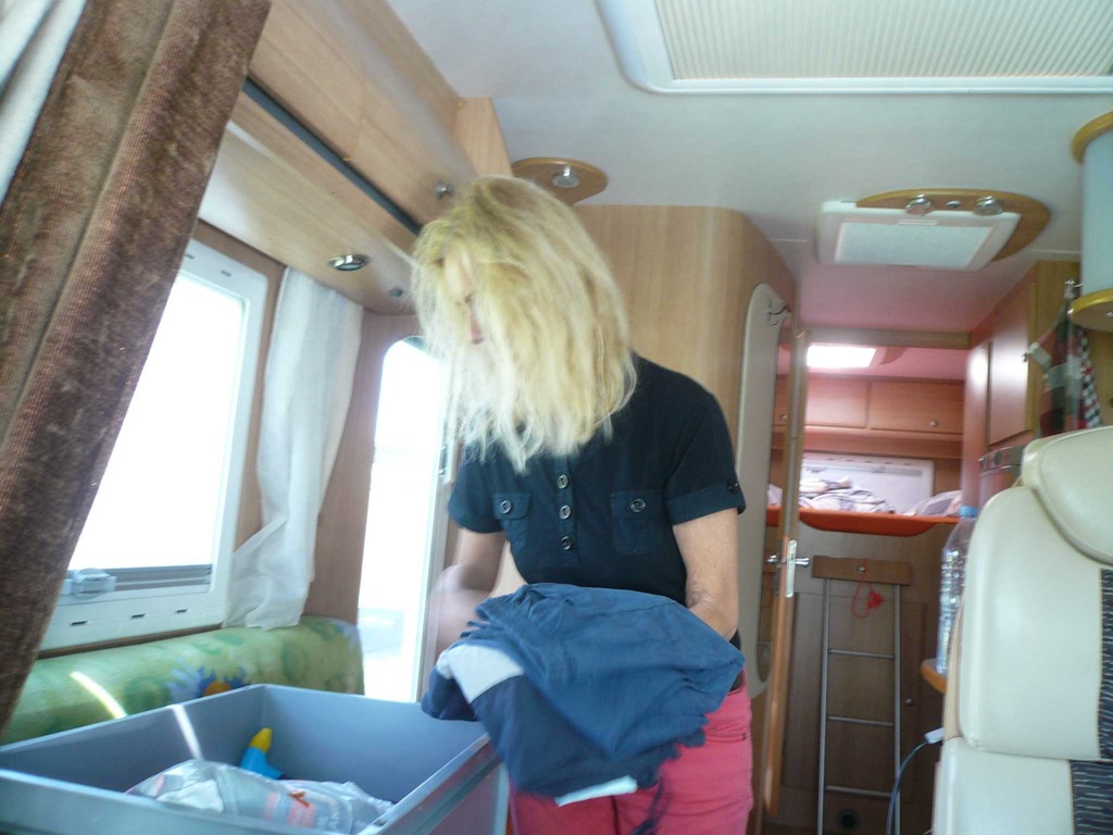 Sonja ist im Element. Schnell sind alle Kleider verstaut. Anschliessend kam der Staubsauger noch zum Einsatz. Da ich oft auf dem Standplatz beim Fahrzeug bin und immer versuche alles im Schuss zu halten gab es nicht viel zu reinigen. Das wird immer sofort gemacht. Für das bin ich zuständig.