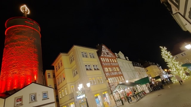 Aus Strom Spar Gründen brennen alle Lichter des Weihnachtsmarkts und der Turm nur von 16 Uhr bis 21 Uhr.
