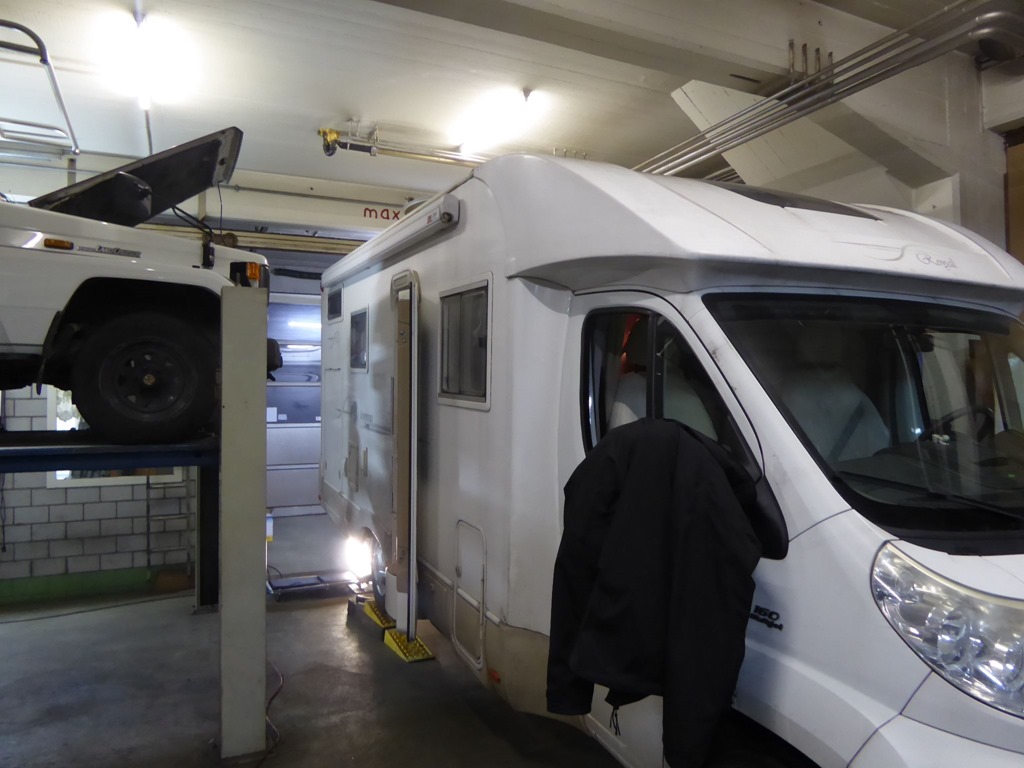 Sofort am Montagmorgen fuhr ich zu meiner Garage des Vertrauens. Adolf, der Chef des 2 Mann Betrieb nahm das Wohnmobil sofort in die Wärme.