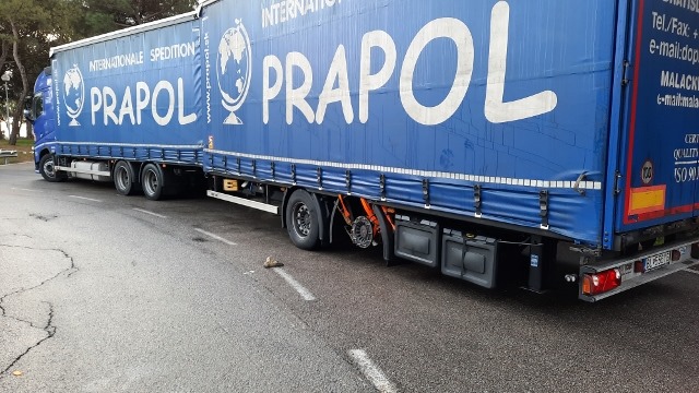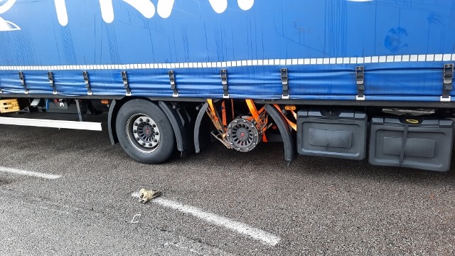 Ich vermute zuerst platzte ein Reifen. So ist er weitergefahren bis auch der zweite seinen Geist aufgab. Nun musste die Achse mit einem Spann-Set hoch gehoben werden so das sie nicht am Boden mitgeschleift wird. Ich weiss nicht ob das Fahrzeug zurück in sein Land fahren möchte. Aber bis in die Slowakei ist es noch ein schönes Stück. Das könnte eine weitere grosse Belastung für die übrigen zwei Reifen werden die noch übrig sind.